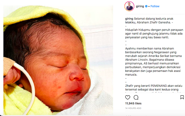 Bayi mungil itu diketahui lahir pada Senin (28/5) sekira pukul 10 malam. Kabar bahagia tersebut disampaikan Giring Nidji lewat akun media sosial Instagram. Lewat unggahannya itu, Giring Nidji mengungkap makna di balik nama putranya itu.